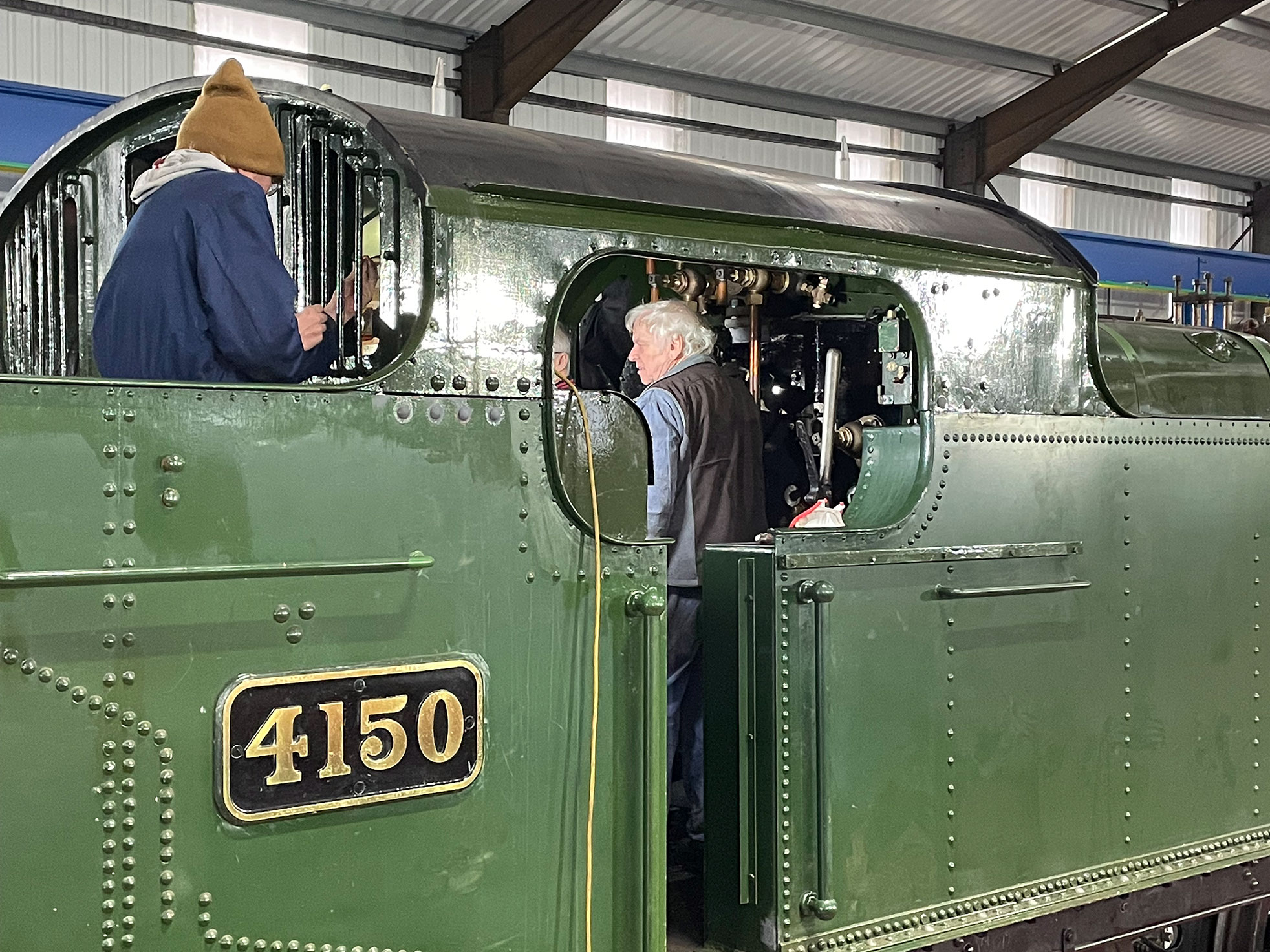 The cab roof in place and the loco back in the shed. Nathan in the bunker fitting the nuts and bolts that hold the roof down. Phil, in the cab is working on the front spectacle plate.
