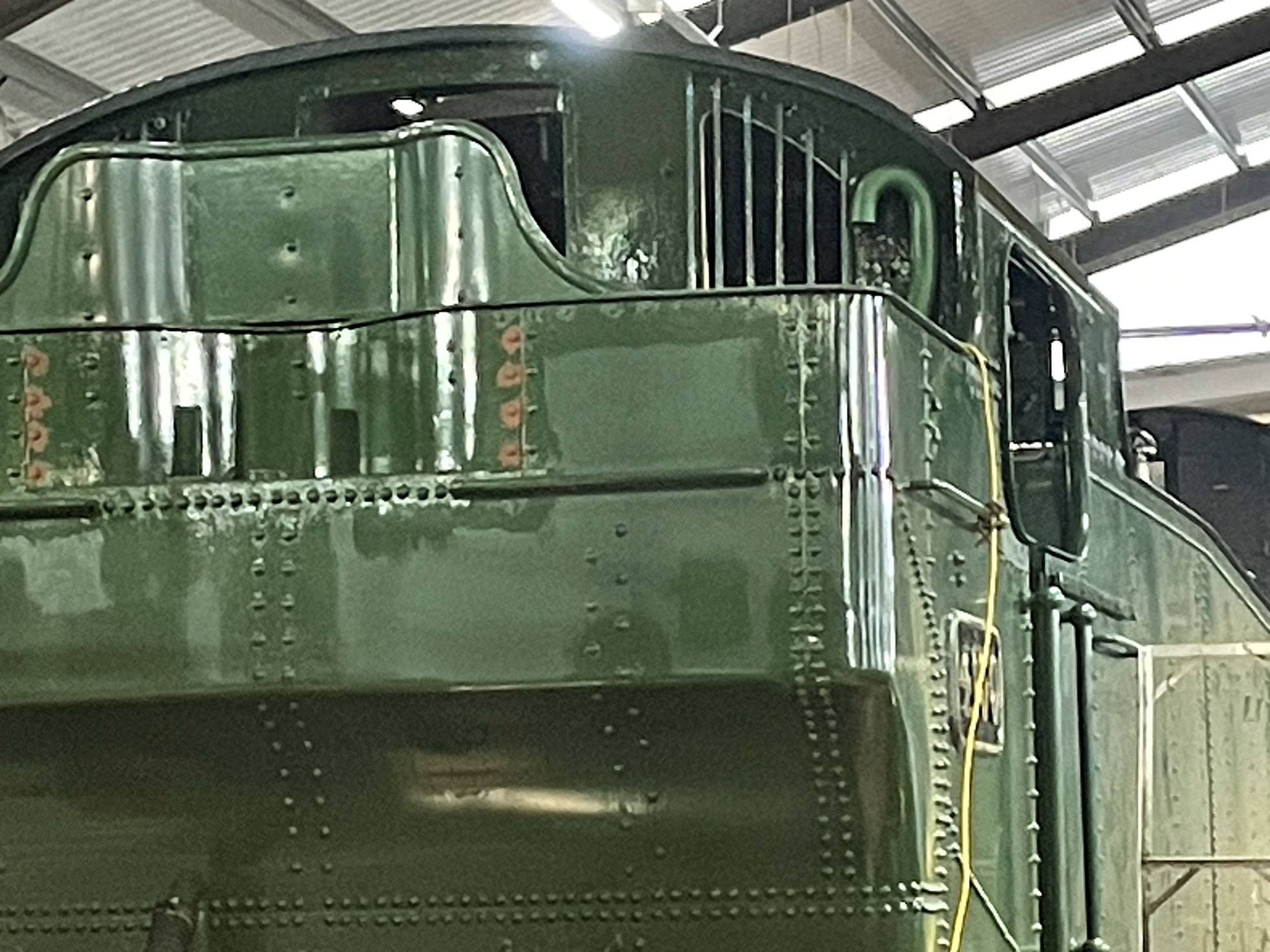 The cab roof in place and the loco back in the shed. Nathan in the bunker fitting the nuts and bolts that hold the roof down. Phil, in the cab is working on the front spectacle plate.